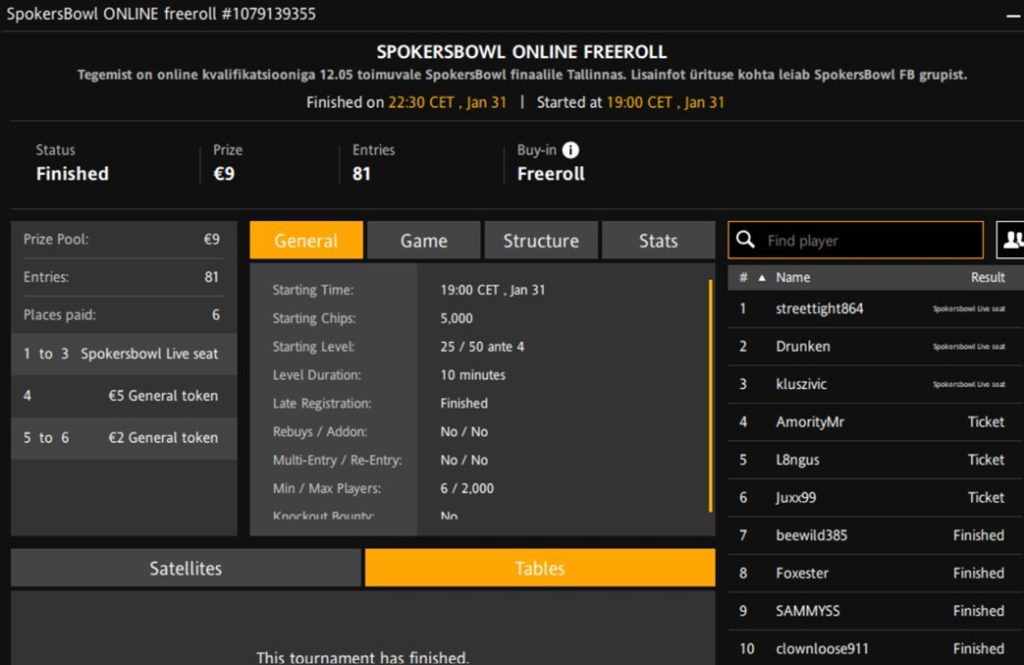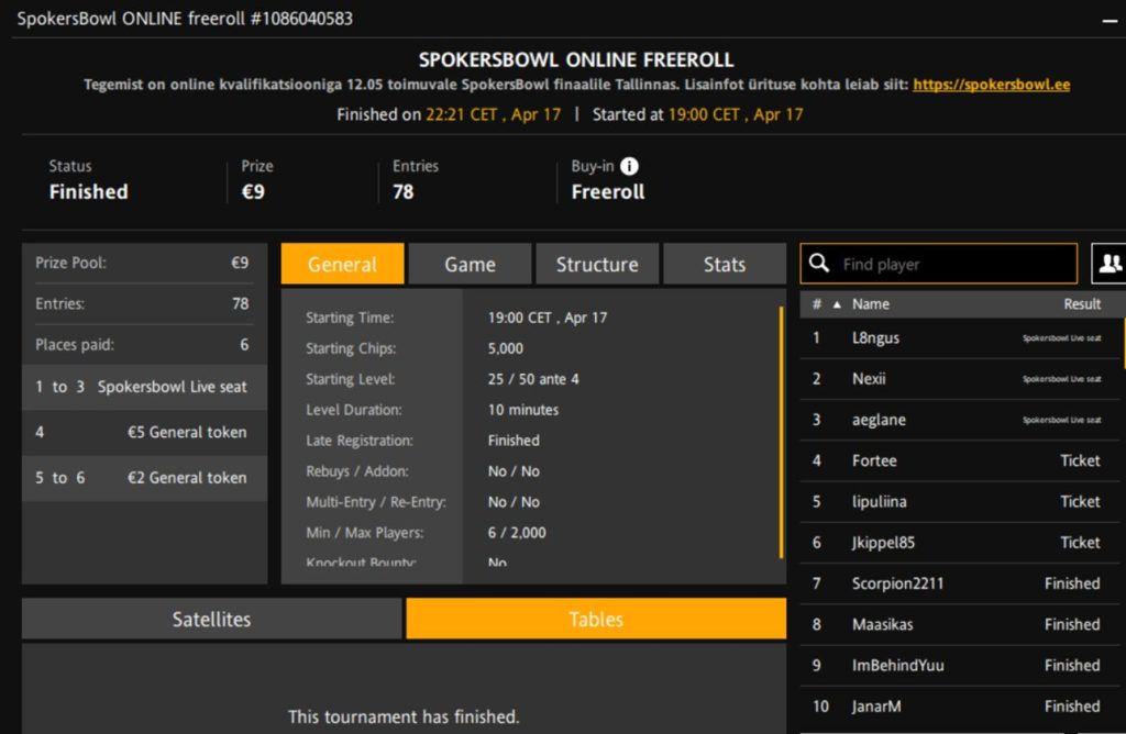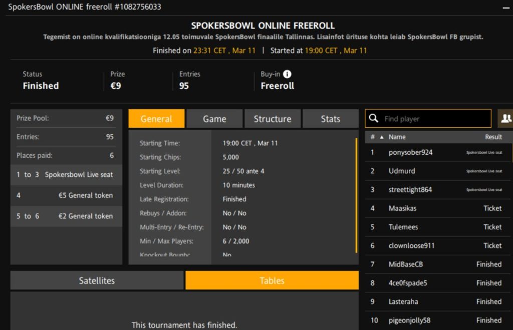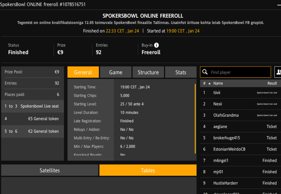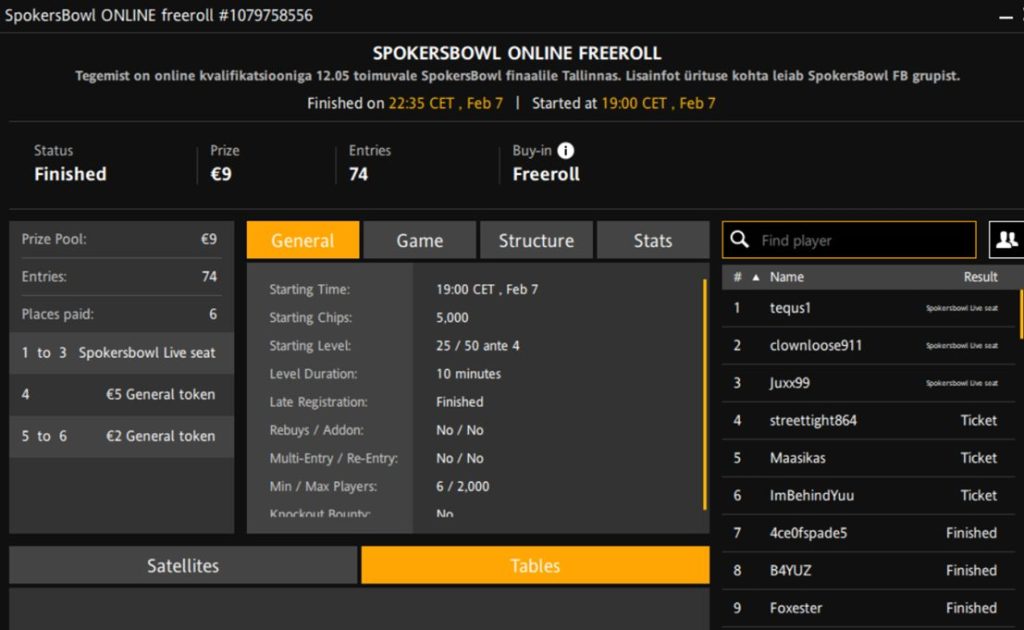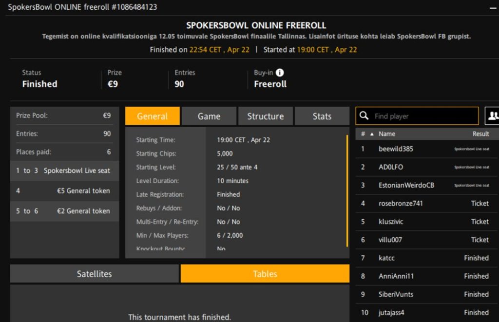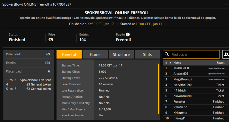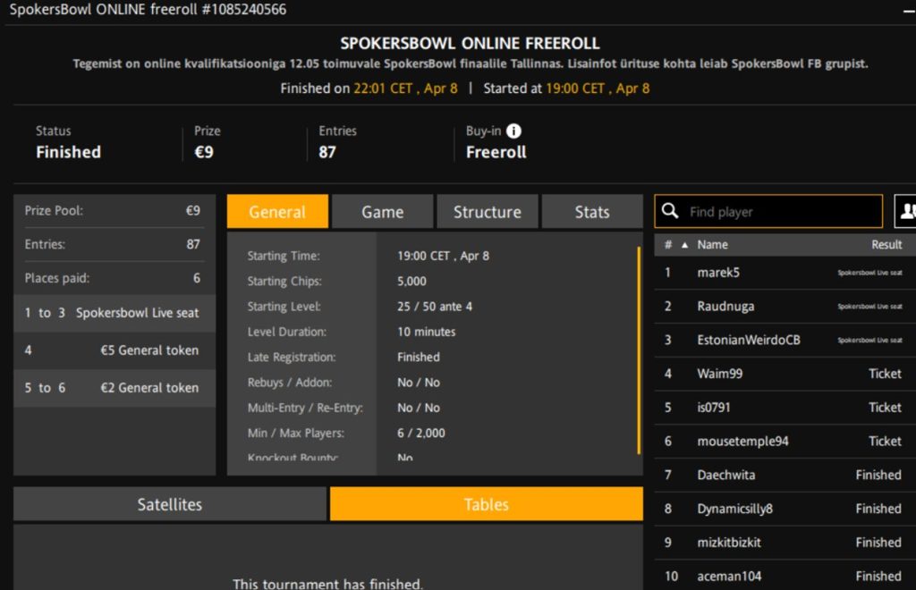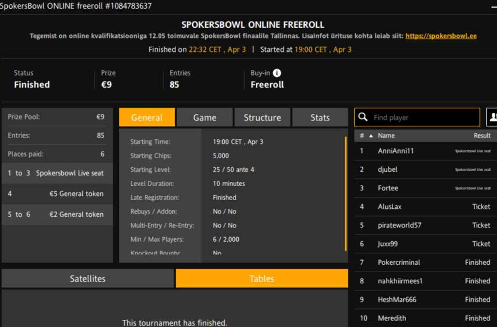 Turniiri nimi | SpokersBowl Online Freeroll |