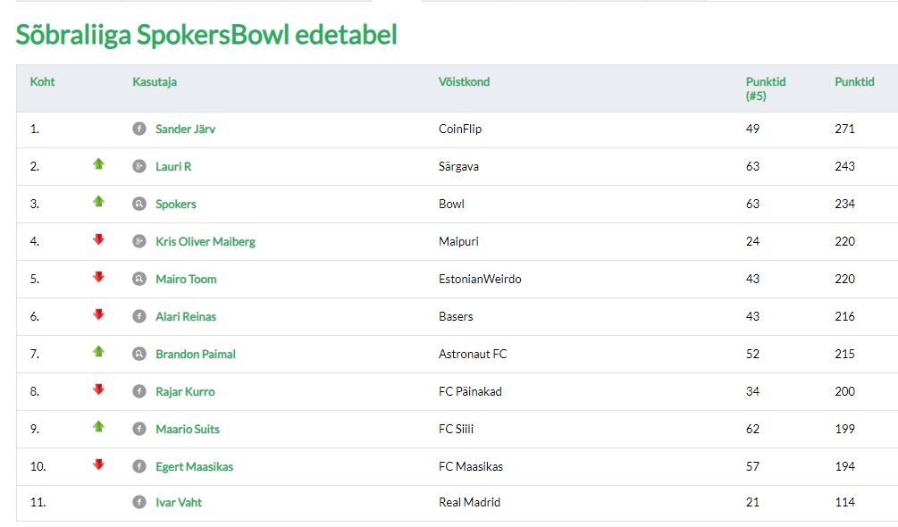 SpokersBowl Fantasy edetabelit juhib Sander Järv