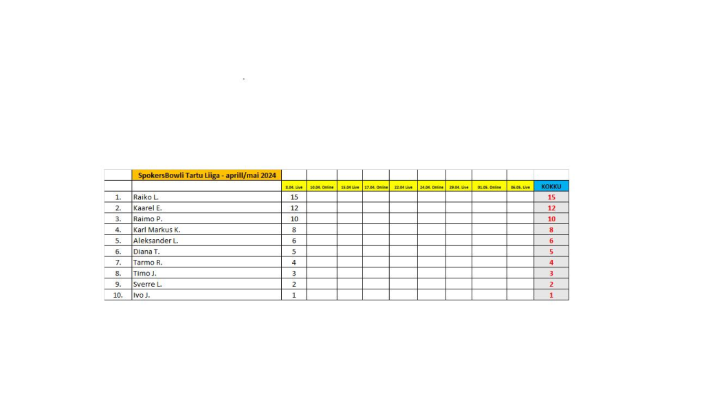 Tartu edetabeli märtsi parimat (esmaspäevased Tartu LIVE turniirid + KOLMAPÄEVASED online turniirid) ootas pääse aprillis toimuvatele pokkeri Tartu Meistrivõistlustele. Lisaks ootab iga LIVE etapi võitjat pääse 12.05 finaali.